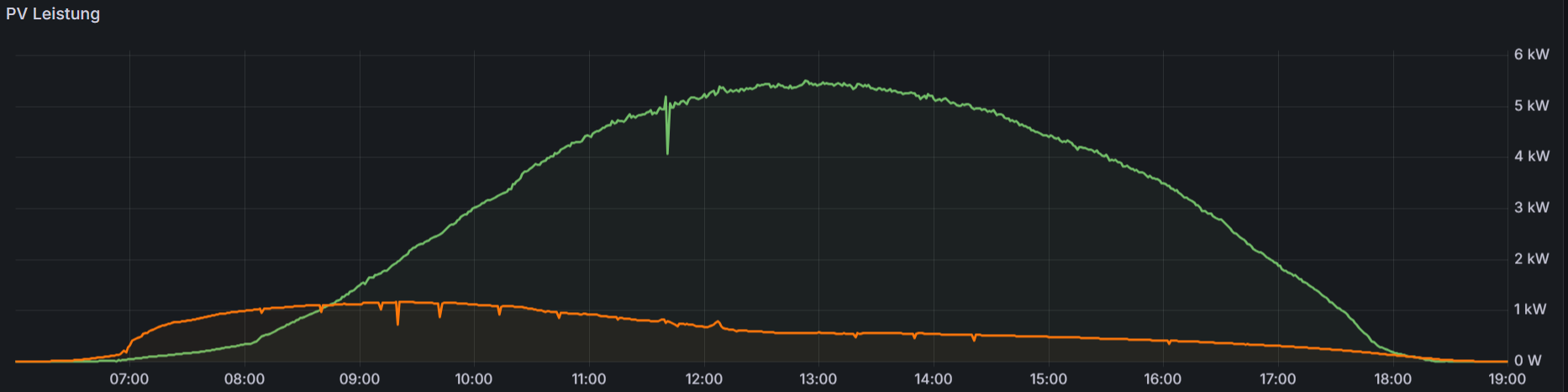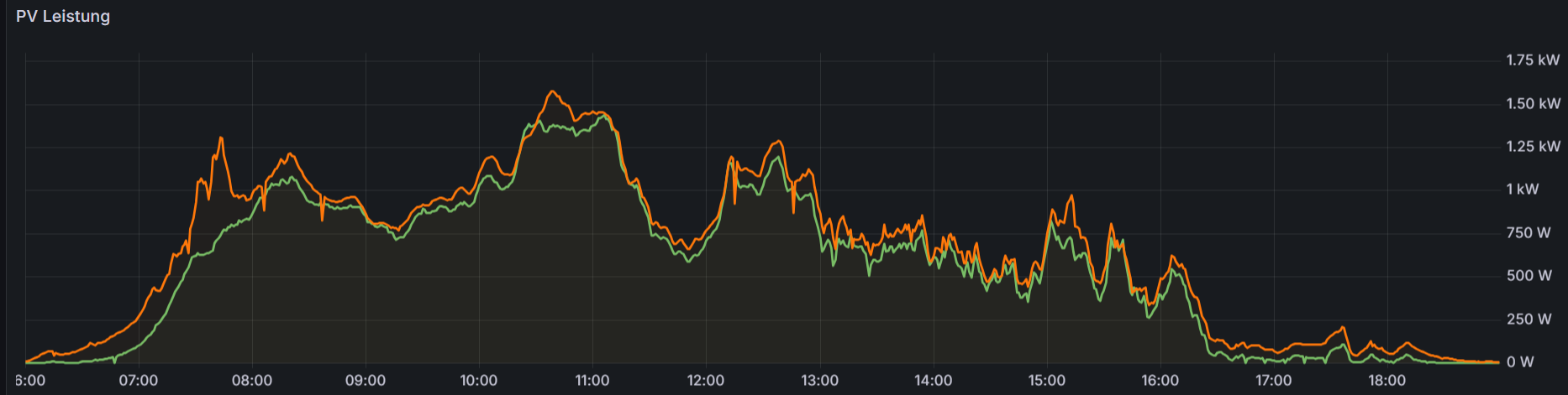 Da ich die Werte meines Nord-Ost Dachs seit Februar in eine Influx Datenbank schreibe, kann ich Euch aber mal den Vergleich von 2 unterschiedlichen Tagen präsentieren.